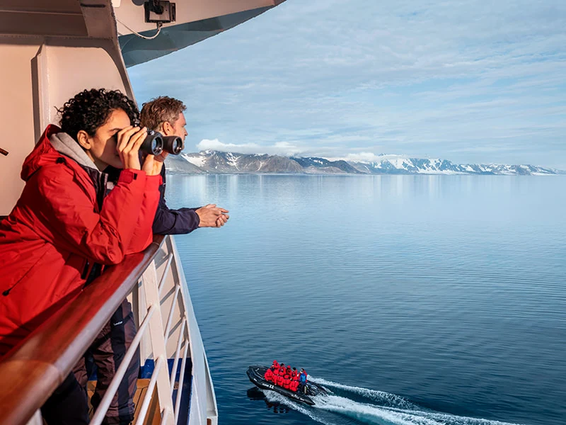Put away your blue lenses as you won't be spending much time looking at screens, but you will want to keep your in-suite binoculars handy as you never know when a beautiful show will happen right in front of your eyes. From whale breechings to dolphin pods swimming past the ship and unbelievable polar bears teaching their cubs the lays of the land, you should be prepared to witness the most spectacular moments on your expedition voyage.