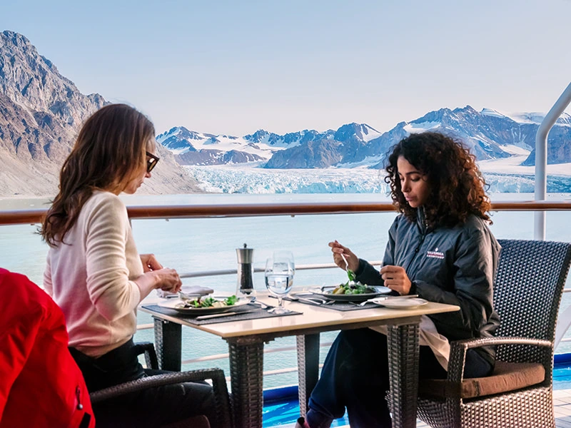 Yes, a restaurant with a view of the Eiffel tower is spectacular, but have you thought about dining with a glacier or a remote Pacific island as your backdrop? When you embark on an expedition journey, you get to dine every day in a new magnificent setting. Whether you see nothing but the sea for miles or you get to enjoy your fare surrounded by cliffs carved by Mother Nature, we are sure the scenery will be a feast for your senses.